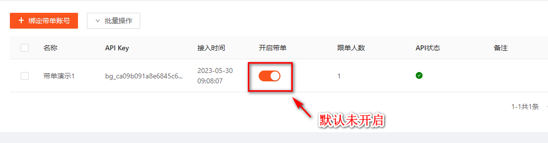 绑定带单号默认是未开启带单的。绑定后,在带单列表中可以开启或关闭带单。